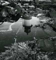 Through black & white photography, a story is told by revealing the weathered charm and historical significance of lighthouses tall against stormy skies and buildings reclaimed by nature.